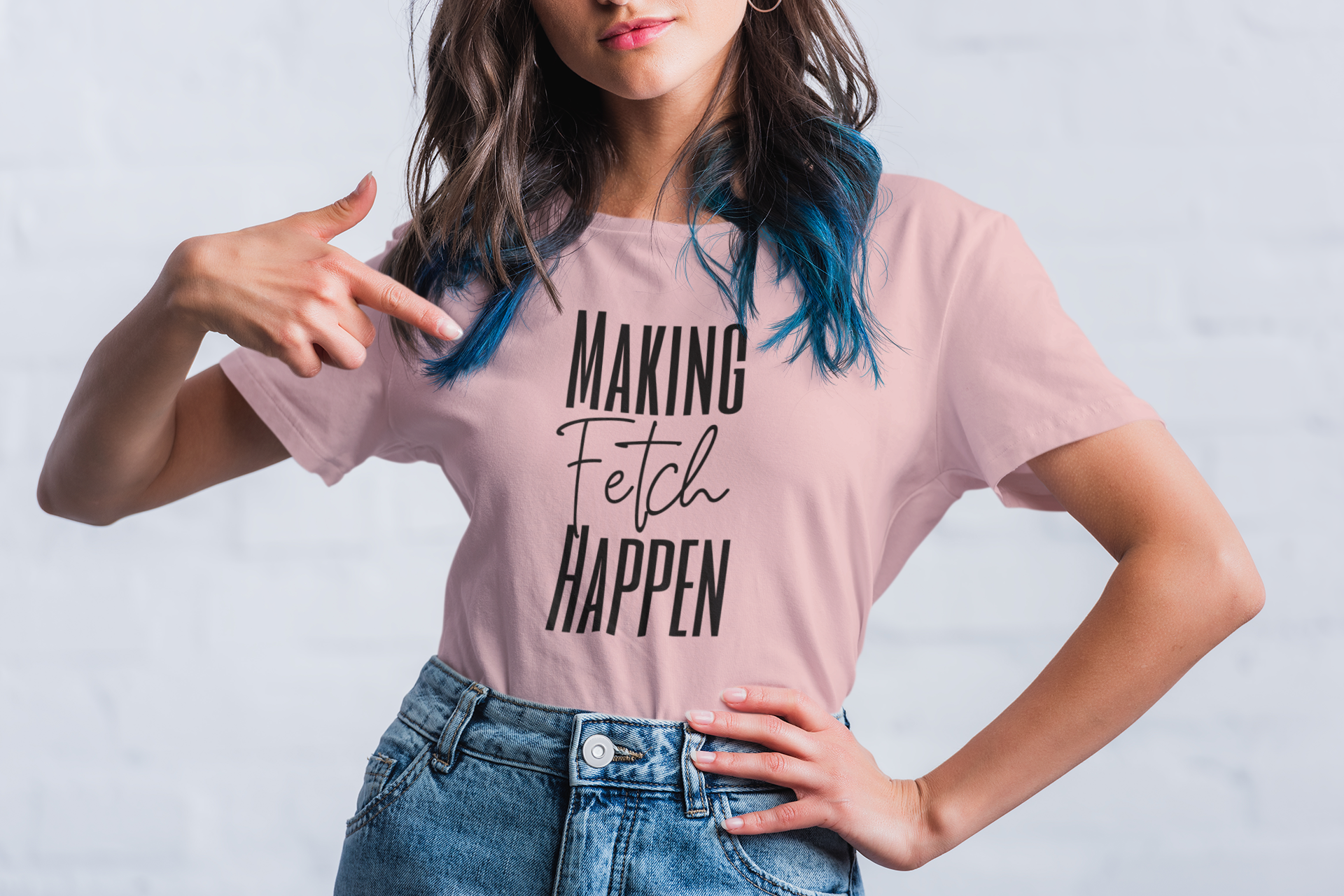 - Making Fetch Happen written in a blend of caps and script font, giving off a fun and sassy vibe to your wardrobe